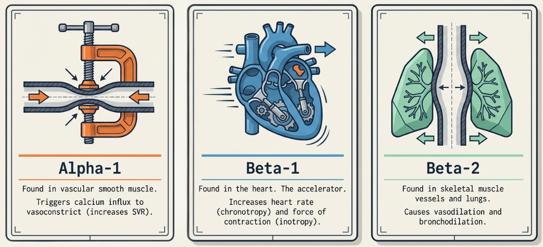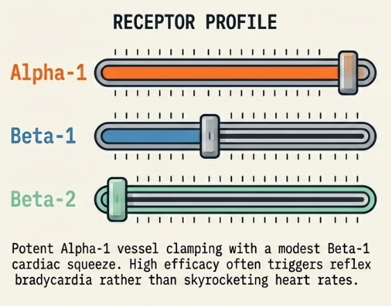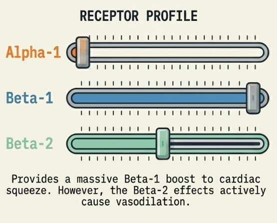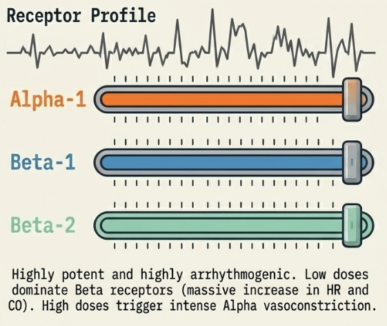 - Adrenaline (Epinephrine): A potent, non-selective agent hitting α and β receptors. Low doses primarily increase cardiac output (CO) via β effects, while high doses cause intense vasoconstriction. It is highly arrhythmogenic and can trigger the "lactate trap," where stimulated glycolysis raises serum lactate even if perfusion is improving.