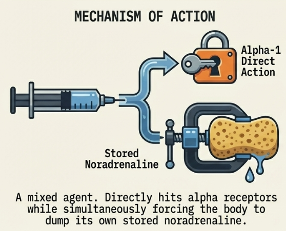- Metaraminol: A mixed direct/indirect agent that triggers the release of stored noradrenaline. Used for short-term hypotension, it carries a high risk of tachyphylaxis, becoming ineffective once the body’s noradrenaline stores are depleted.