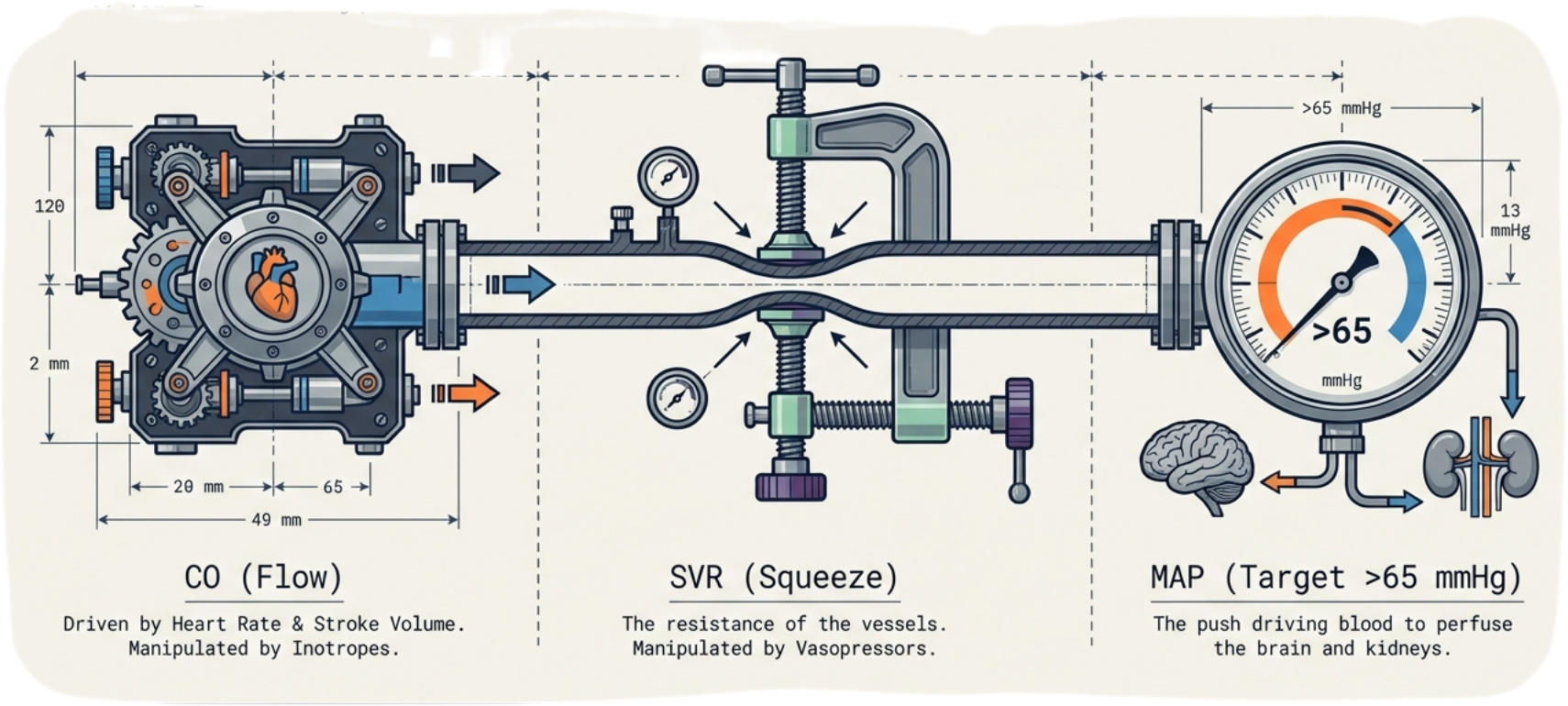 Shock is fundamentally defined as tissue hypoxia, where a supply-demand mismatch prevents organs from meeting metabolic needs. To restore stability, clinicians manipulate the equation MAP = CO × SVR, targeting a Mean Arterial Pressure (MAP) of 65 mmHg to maintain vital organ perfusion