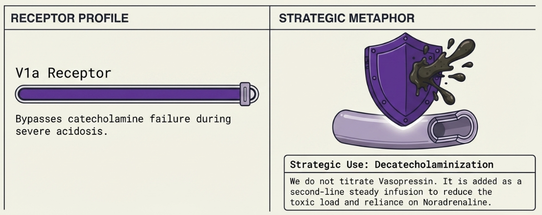 - Vasopressin: Acting on V1a receptors, it provides vasoconstriction through a pathway independent of catecholamines. It remains effective during acidosis, where other drugs often fail. It is primarily used for "decatecholaminization"—adding it as a second-line adjunct to lower toxic noradrenaline requirements, which helps protect renal function and reduce arrhythmias. It is typically given at a fixed dose of 0.03 units/min.